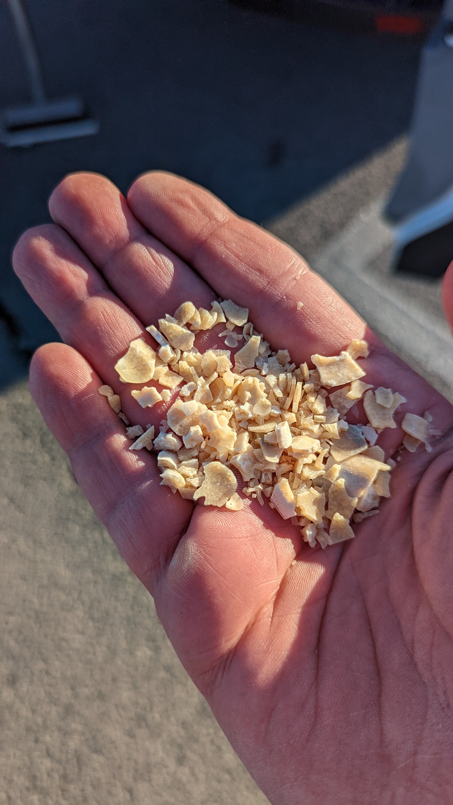 Put an ounce in the bottom of a pail and see.Dry Slurry residue is more "crumbly, brittle, easy break" than that flaky stuff